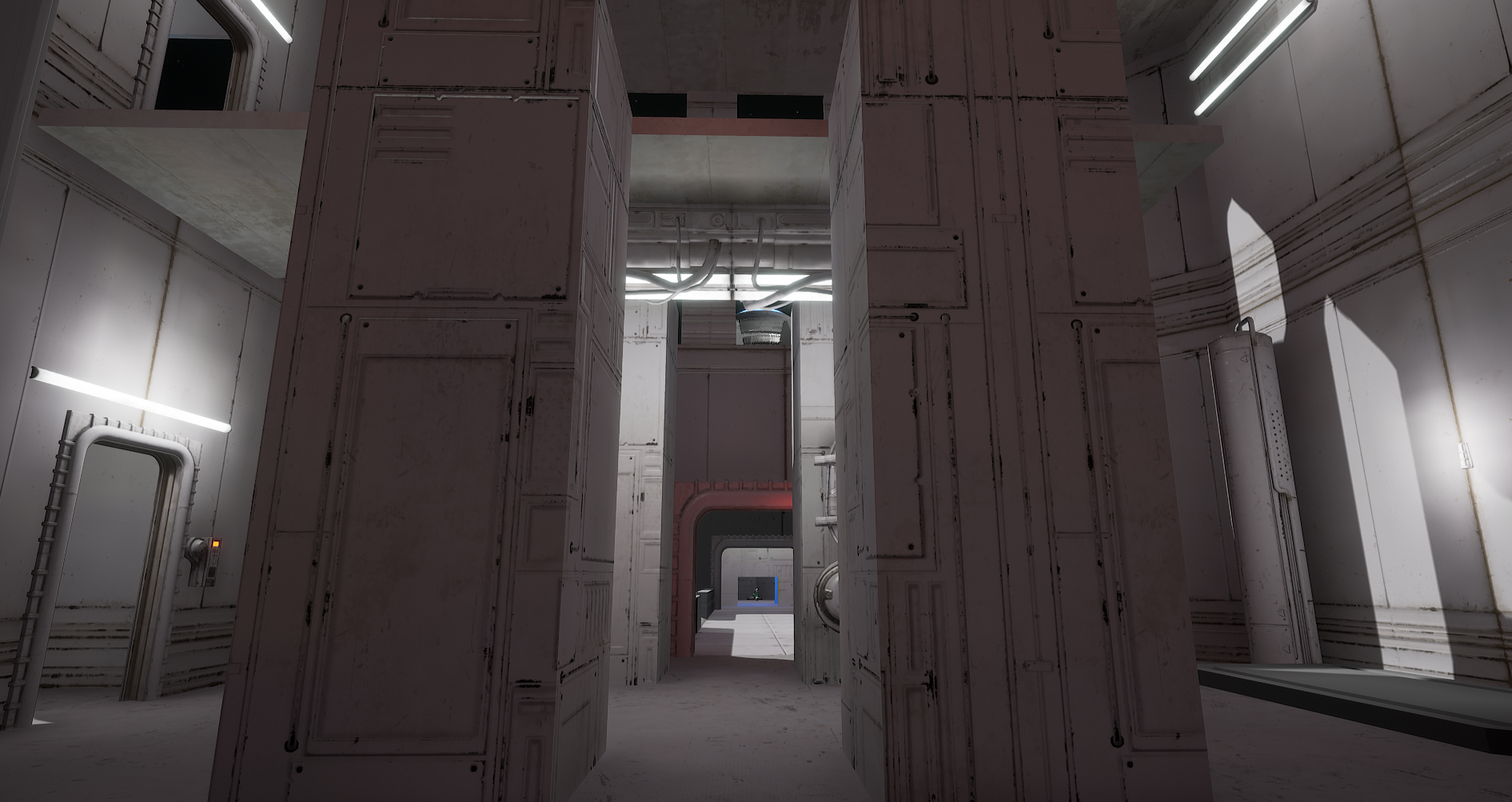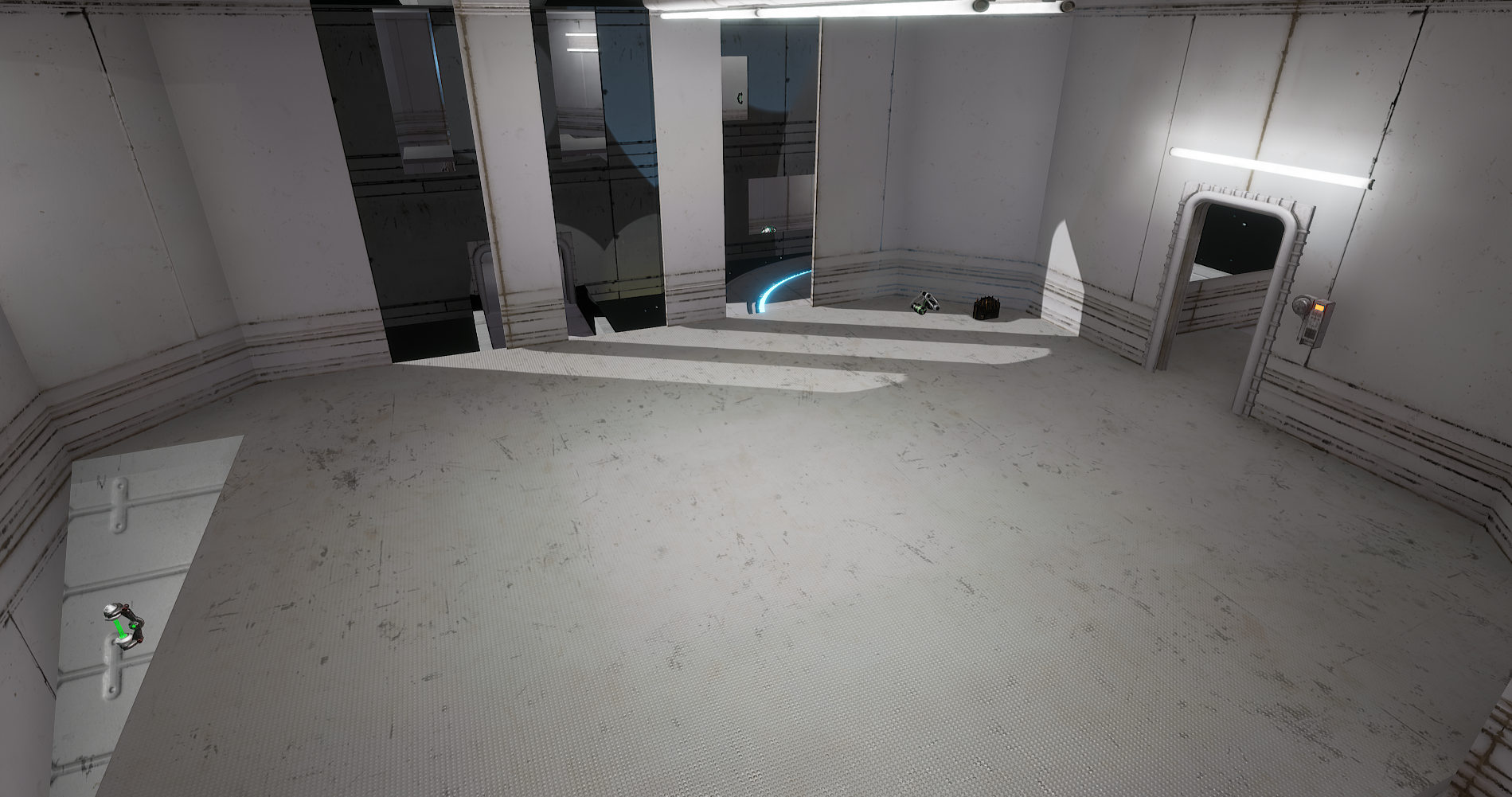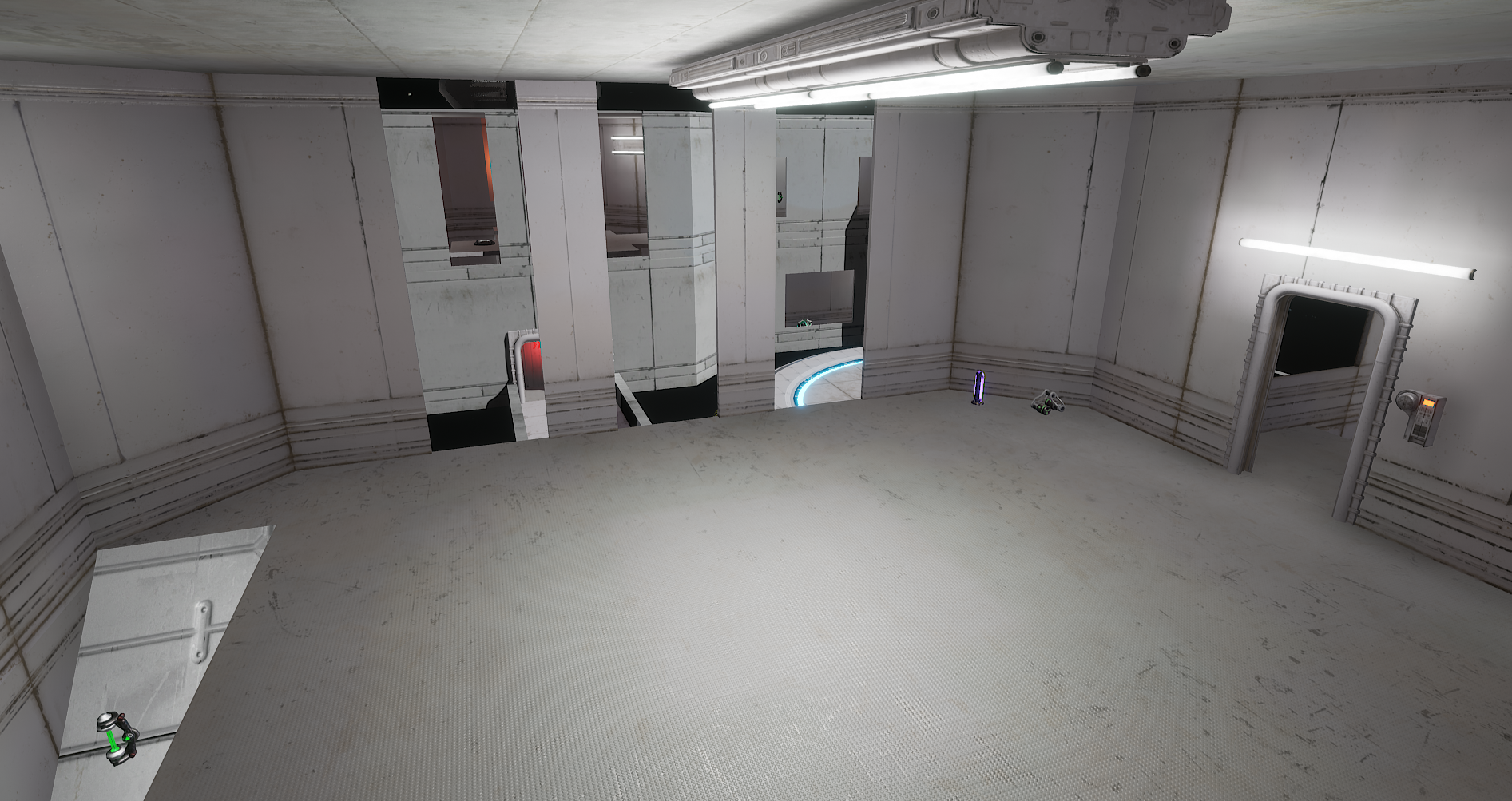 While one of the main goals was to support long-ranged weapons, I wanted to promote a more aggressive playstyle by ensuring all rooms had multiple entry and exit points that allowed constant movement, and no place was completely safe. In addition, most rooms have openings designed for bold and creative shortcuts.